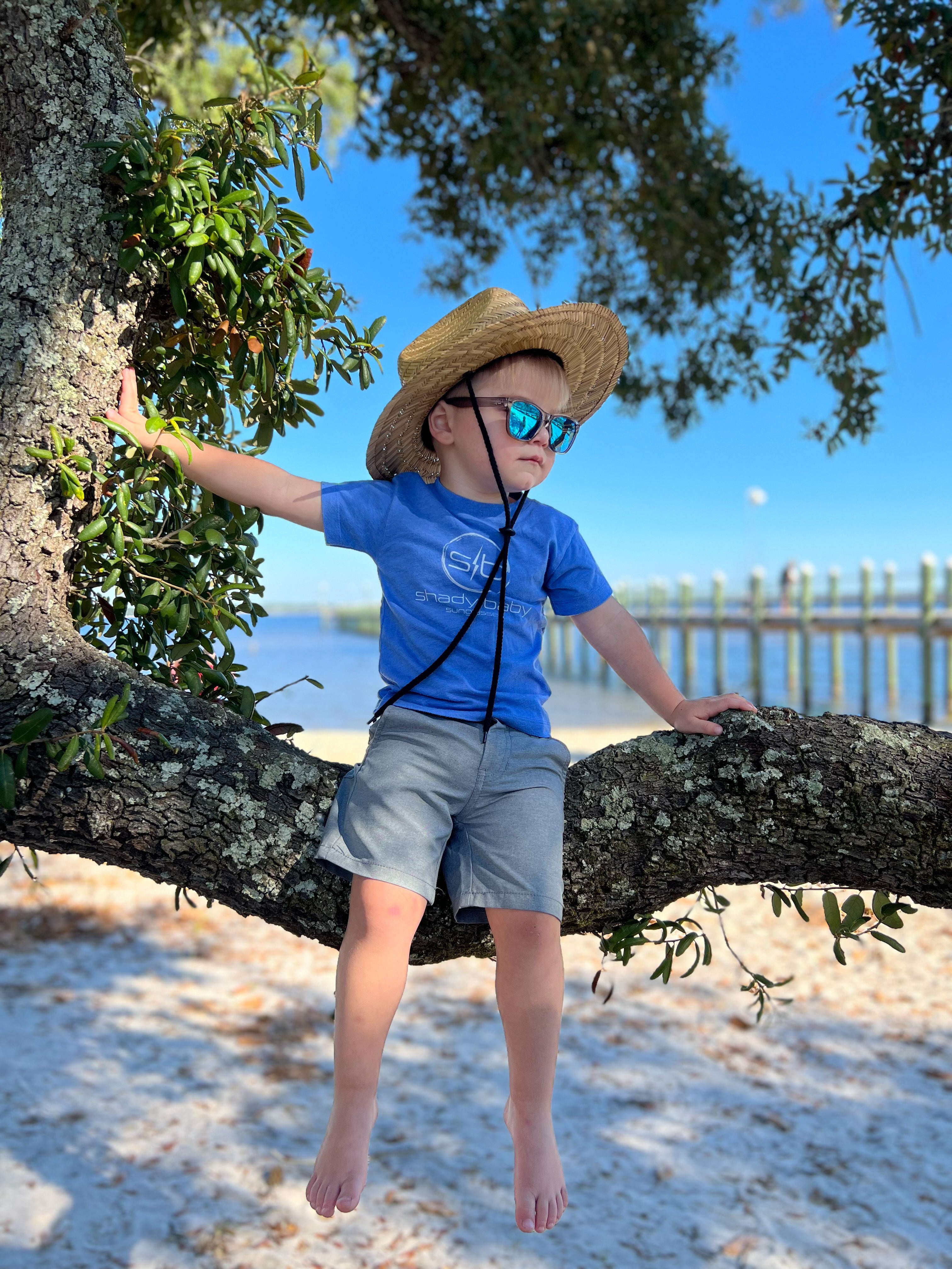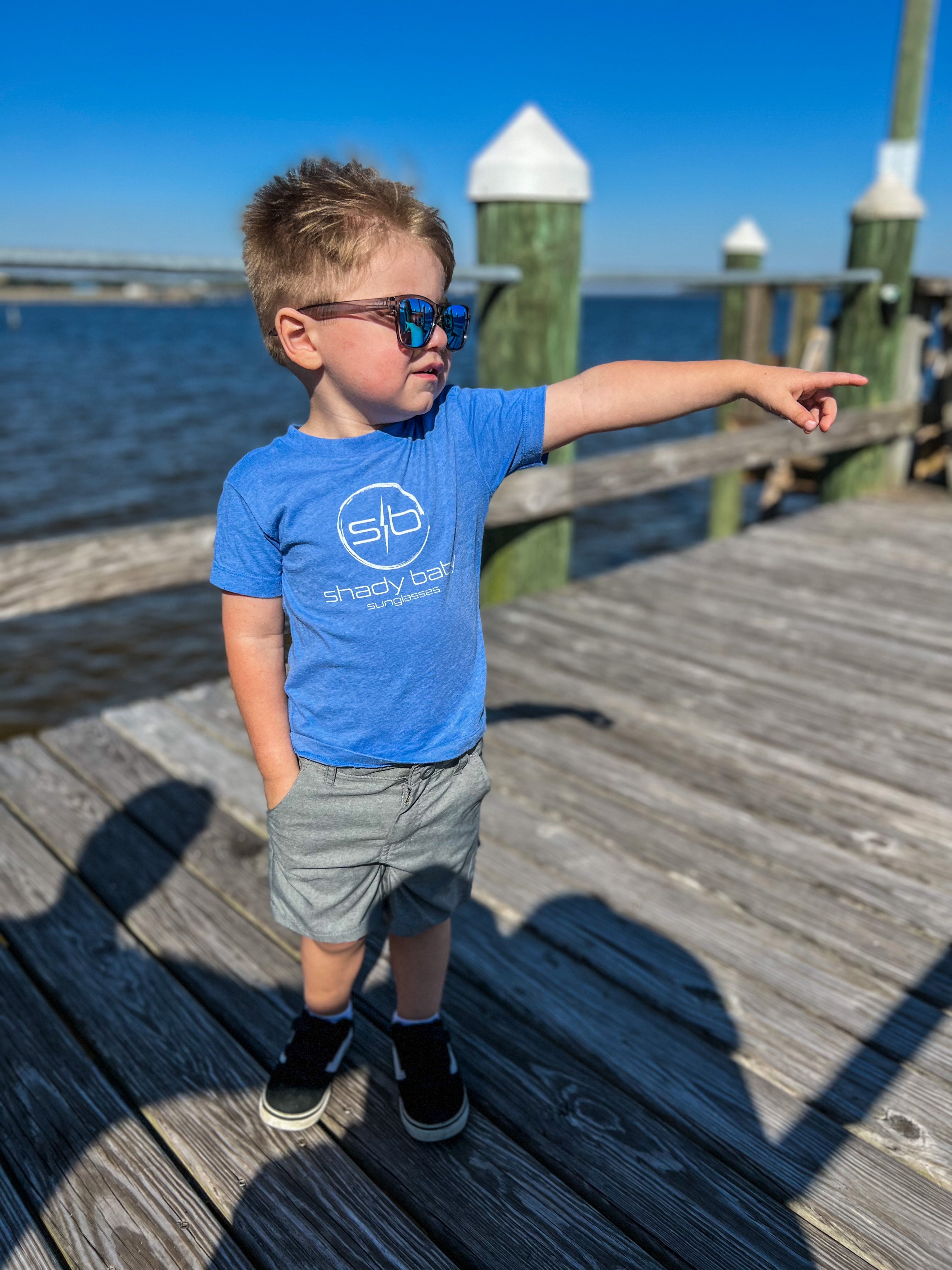 Shop CaribbeanJaxon (2 years old) is pairing our Caribbean polarized sunglasses with our Original t-shirt in Heather Columbia Blue.